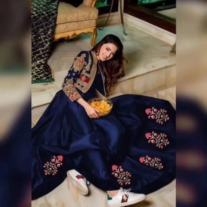 Elegant Blue Shamoz Silk Embroidered Maxi with Jacket Set