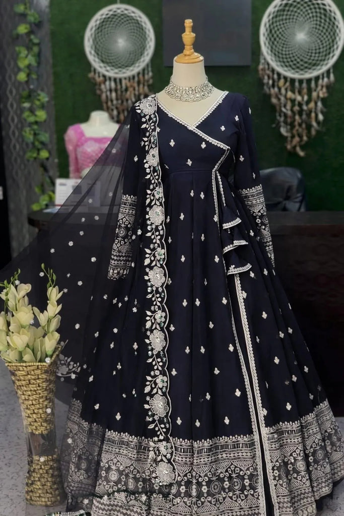 Step into elegance with our Women's Embroidered Chiffon Maxi Suit. This stunning 3-piece set includes an exquisitely designed Angrakha, comfortable trousers, and a flowing dupatta, perfect for any occasion.
