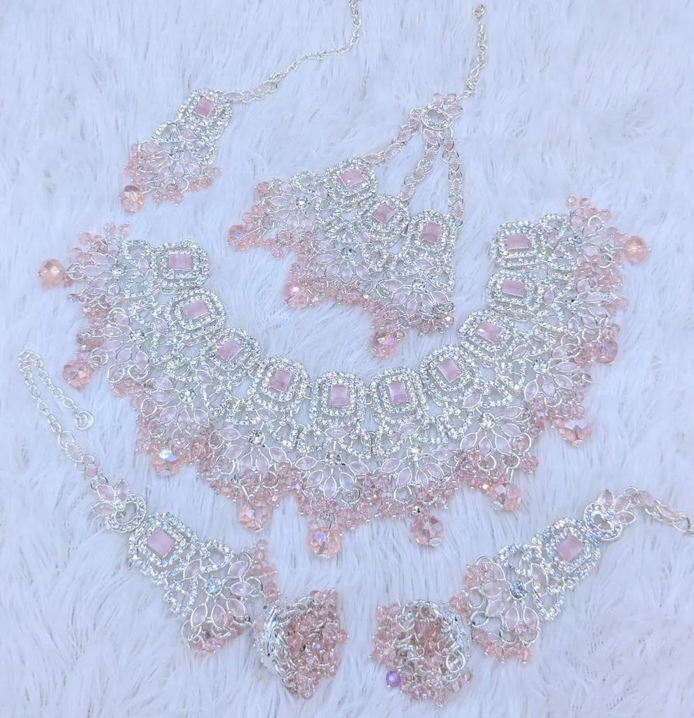 Elevate your occasion wear with this elegant 5-piece artificial necklace set featuring delicate pink pearls arranged in a floral motif. Crafted on a metal base with a refined finish, the set is designed for women who appreciate feminine, statement jewelry without compromising comfort. Perfect for parties, weddings, and gifting.