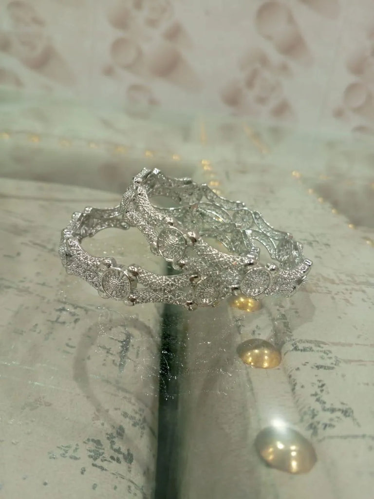 Elegant set of two silver-plated kara bangles crafted from a premium metal alloy with a smooth, glossy finish. These standard-size bangles are designed to fit most wrists and combine traditional charm with a modern touch. Lightweight, comfortable and skin-friendly, they make a versatile addition to everyday outfits as well as party and wedding looks — also ideal for gifting.